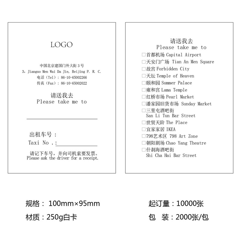 - 包装规格:250g白卡(巨圆、华德泰) 100mm×95mm 2000张/包