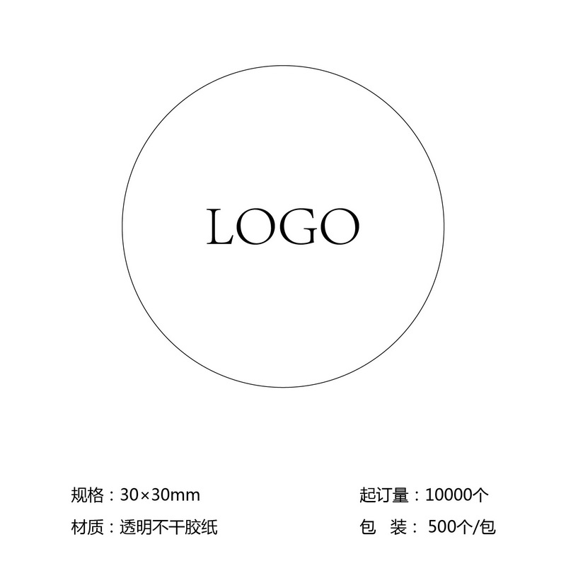 - 包装规格:透明不干胶纸 30×30mm 单面专色 覆膜 扪切 500个/包